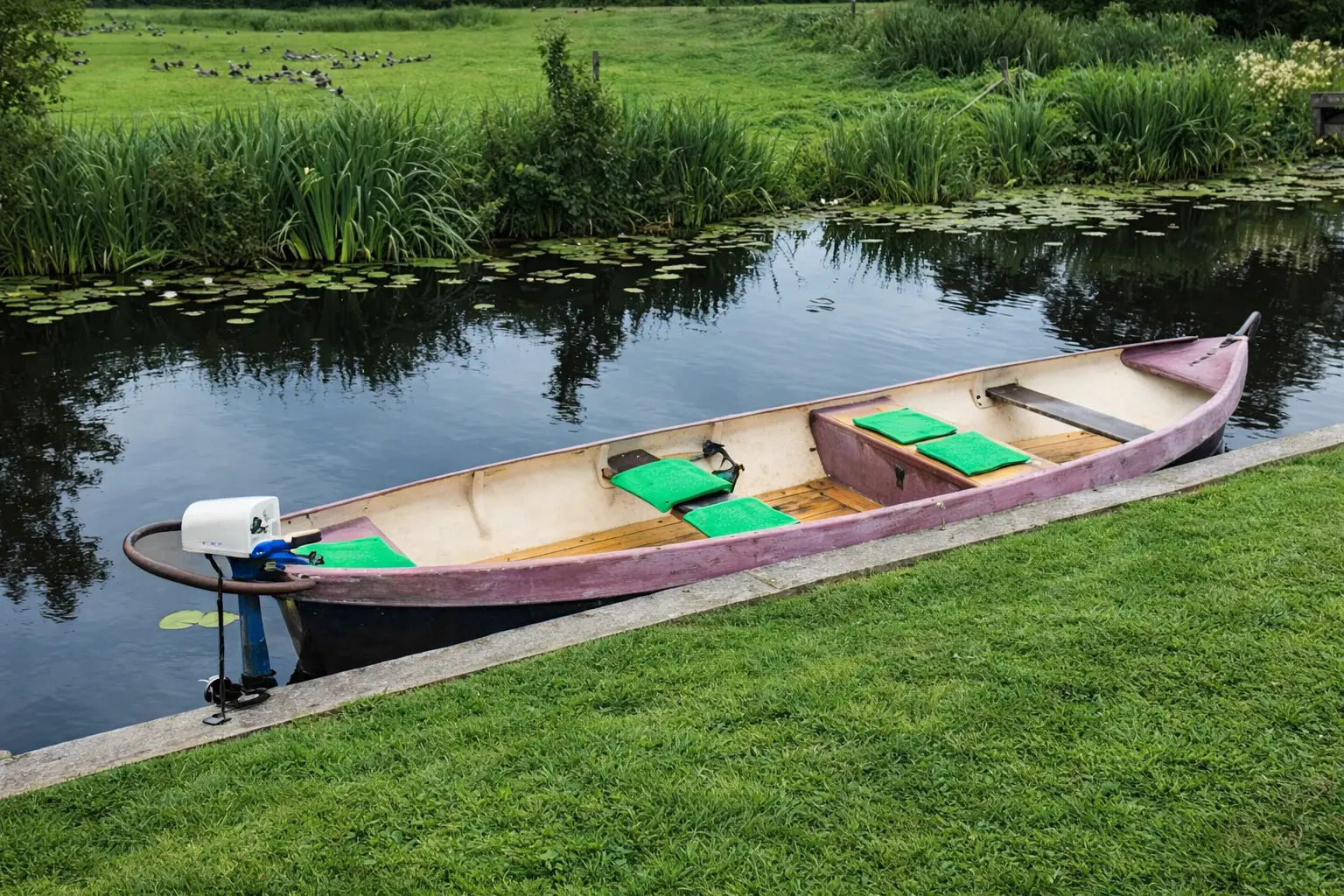 This electrically powered whisper boat with loose cushions can be rented. This whisper boat is easy to drive. With this whisper boat, which is suitable for a maximum of 4 people, you can sail without a license. This way you can discover Giethoorn silently.